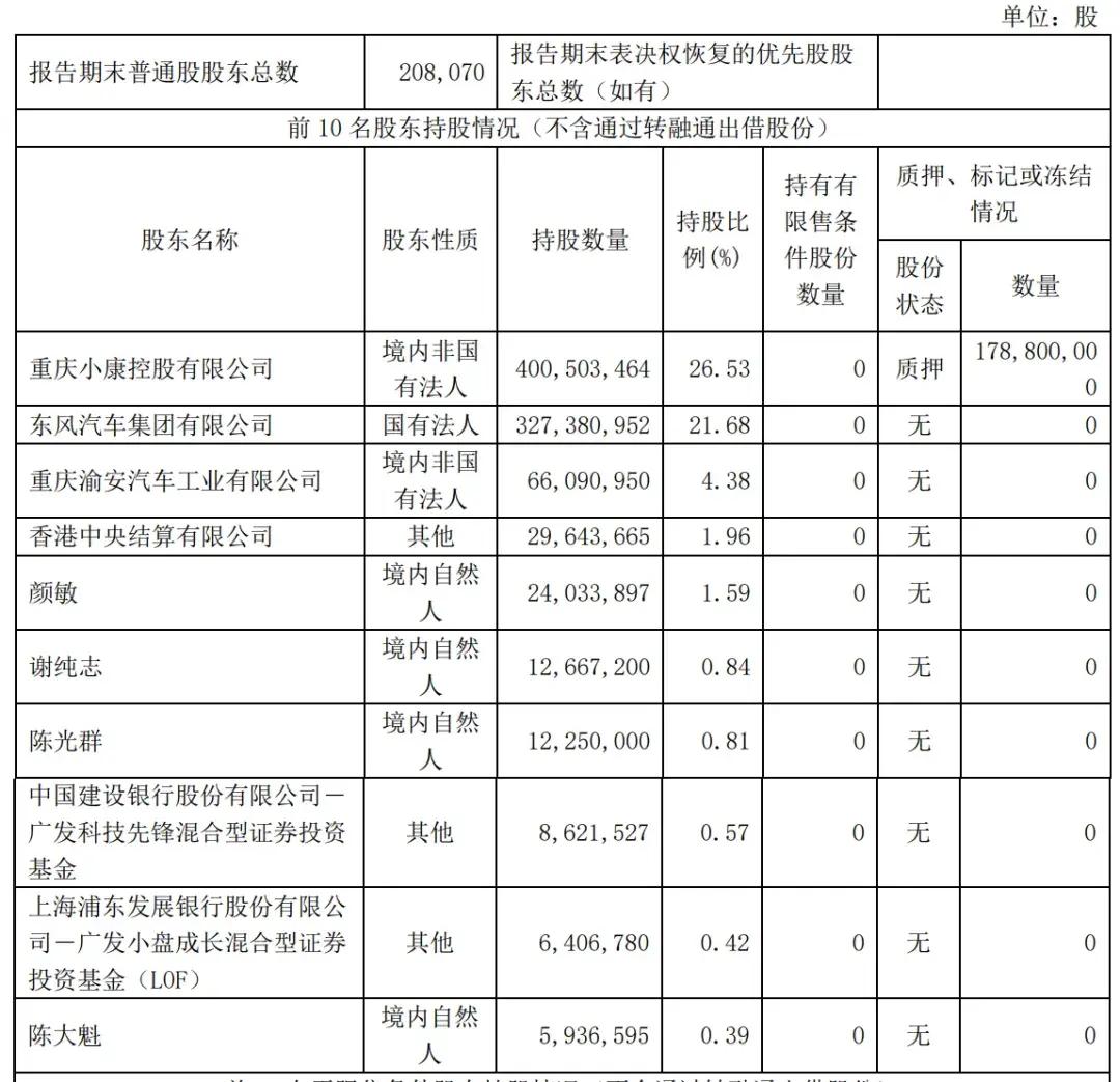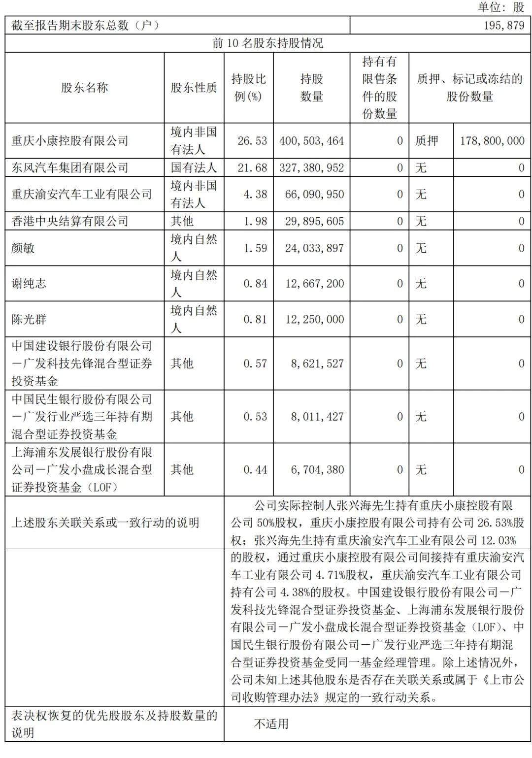 限制2024年9月30日,重庆小康控股有限公司(简称“小康控股”)执股26.53%,东风汽车公司执股21.68%,重庆渝安汽车工业有限公司(简称“渝安工业”)执股4.38%,香港中央结算有限公司执股为1.96%,颜敏执股为1.59%;