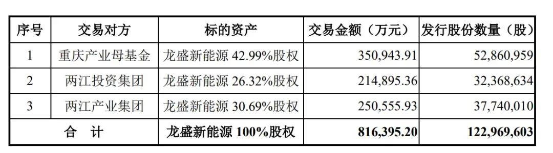 2024年9月,赛力斯发布公告,称赛力斯拟通过刊行股份的表情购买重庆产业母基金、两江投资集团、两江产业集团执有的龙盛新动力100%股权。